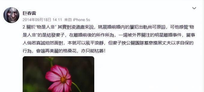 在巨春雷的长篇文章发布之后,记者尝试通过多个途径与姚晨取得联系,但都没有得到任何反馈。几日之后,姚晨分享了2009年的一则旧微博,并在其中写道:“满纸荒唐言,人事已非。”这条过去的微博内容,实际上是凌潇肃赠送的格桑花。
