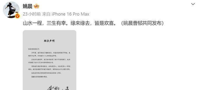 姚晨官宣离婚3月16日15:30,姚晨和曹郁意外地同时登上了热搜榜单。这两个人共同发布了一份声明,正式宣布了他们多年前已经离婚的事实。当时,为了确保年幼孩子的安全,他们决定向外界隐瞒他们离婚的真相。