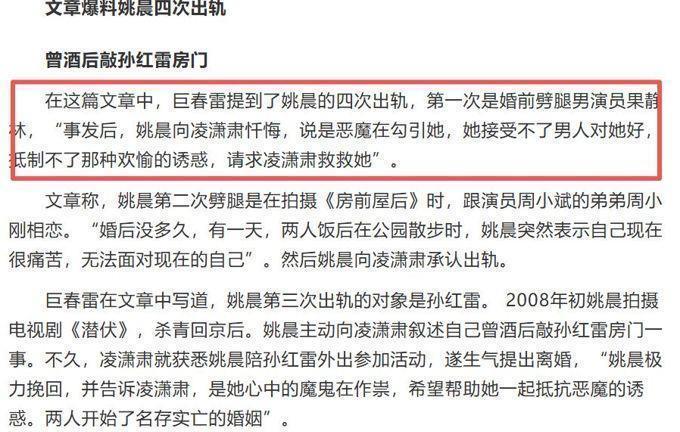 这篇题为《姚晨和凌潇肃那段被歪曲的往事》的长篇文章,使得姚晨和凌潇肃的婚姻关系彻底沦陷到了“罗生门”的境地”。巨春雷在文章中透露,姚晨在凌潇肃的婚姻生活中曾有四次不忠行为。曹郁恰好是这些人中的一个。